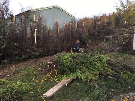 This was because once we had felled and disposed of the wood / greenery it would require heavy plant machinery via that rear access to grub up the roots once they had been felled and the wood dealt with. You will perhaps get a feel for the issue from the photographs shown below as we tackled the monsters (note Gill with the chainsaw):